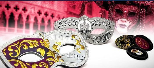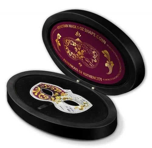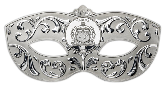 Capture the stunning art and the excitement of the Venice Carnival with this large and innovative 2023 five ounce fine silver mask shaped coin. The fully shaped coin features Venetian patterns and polished clefs refined with rich red and gold coloring. It has been issued by Samoa with a face value of $10 and an extremely low mintage of just 499 coins.